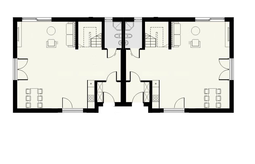 Parter: 1. wiatrołap 3,33 m2, 2. korytarz 4,63 m2, 3. łazienka 5,58 m2, 4. schowek 1,58 m2, 5. salon z jadalnią i aneksem kuchennym 27,61m2,