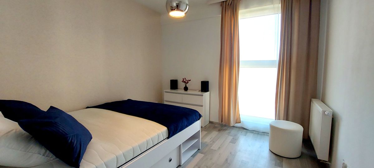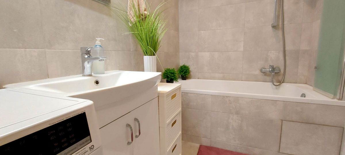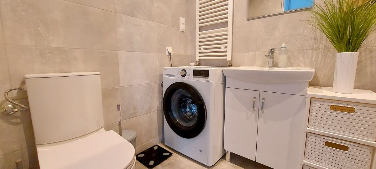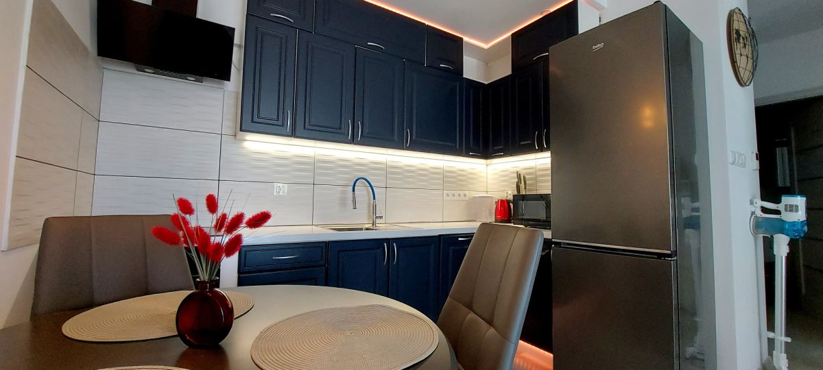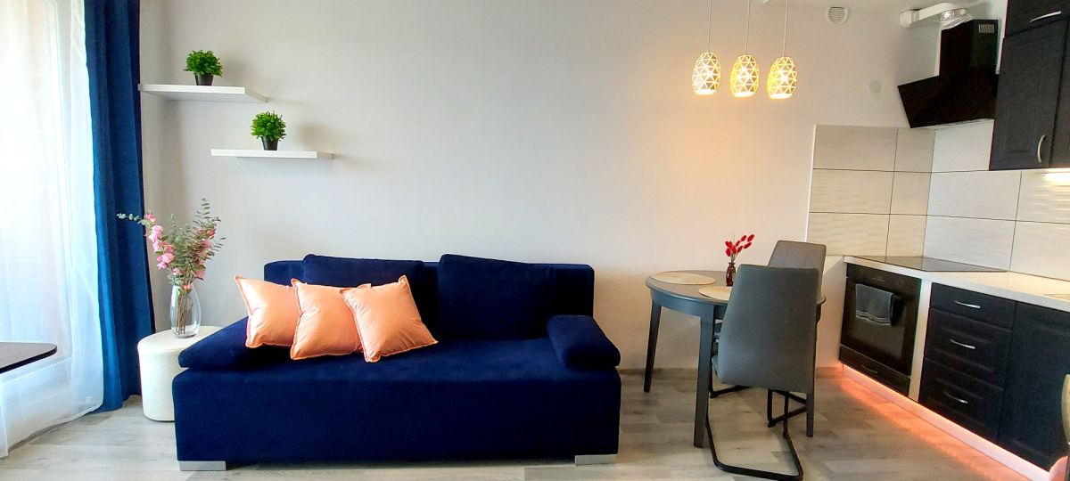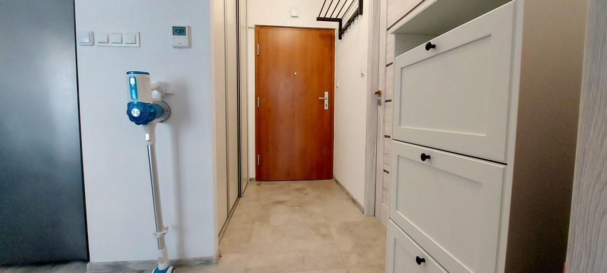 Mieszkanie jest w pełni umeblowane, tj. w kuchni zabudowa na wymiar wraz ze sprzętem AGD (płyta indukcyjna, piekarnik elektryczny lodówka, zmywarka, okap), rozkładany stół z krzesłami, w salonie rozkładana sofa, biurko, w sypialni podwójne łóżko z materacem, rzutnik multimedialny, stolik nocny, w łazience wanna, pralka, umywalka, kompakt WC. W przedpokoju pojemna szafa garderobiana.